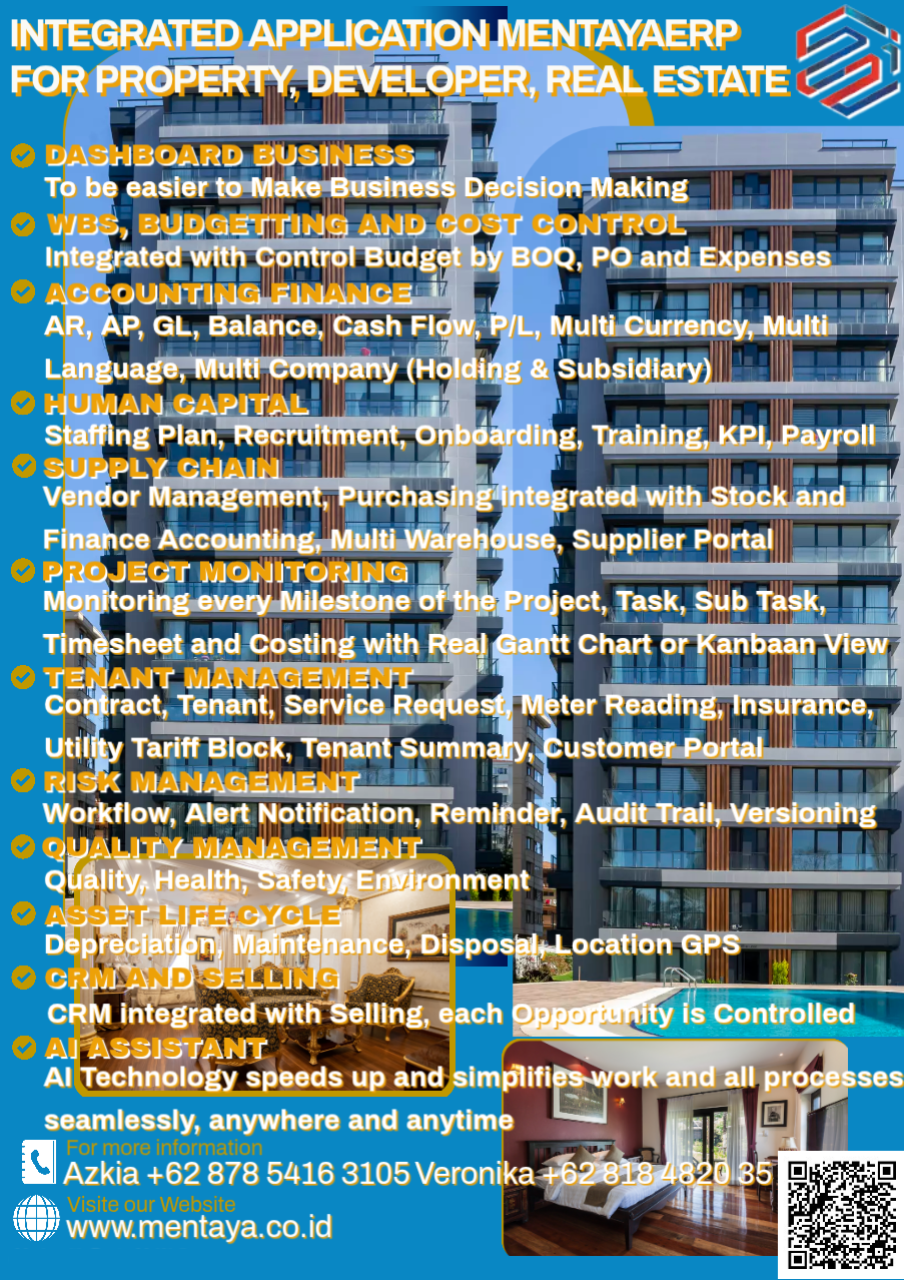 Lakukan Kerja Terbaik Organisasi dengan Perangkat Lunak MentayaERP untuk bisnis Property, Developer dan Real Estate AndaJalankan bisnis Property, Developer dan Real Estate anda dengan mulus dan efisien. Informasi lebih lanjut, Hubungi 0878-4681-3641, 0818-4820-35, info@mentaya.co.id